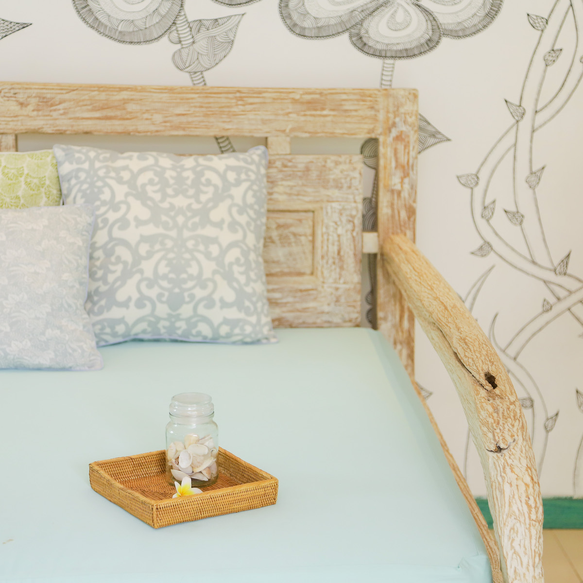 飾り棚の上を華やかに彩るアタ製トレイ。