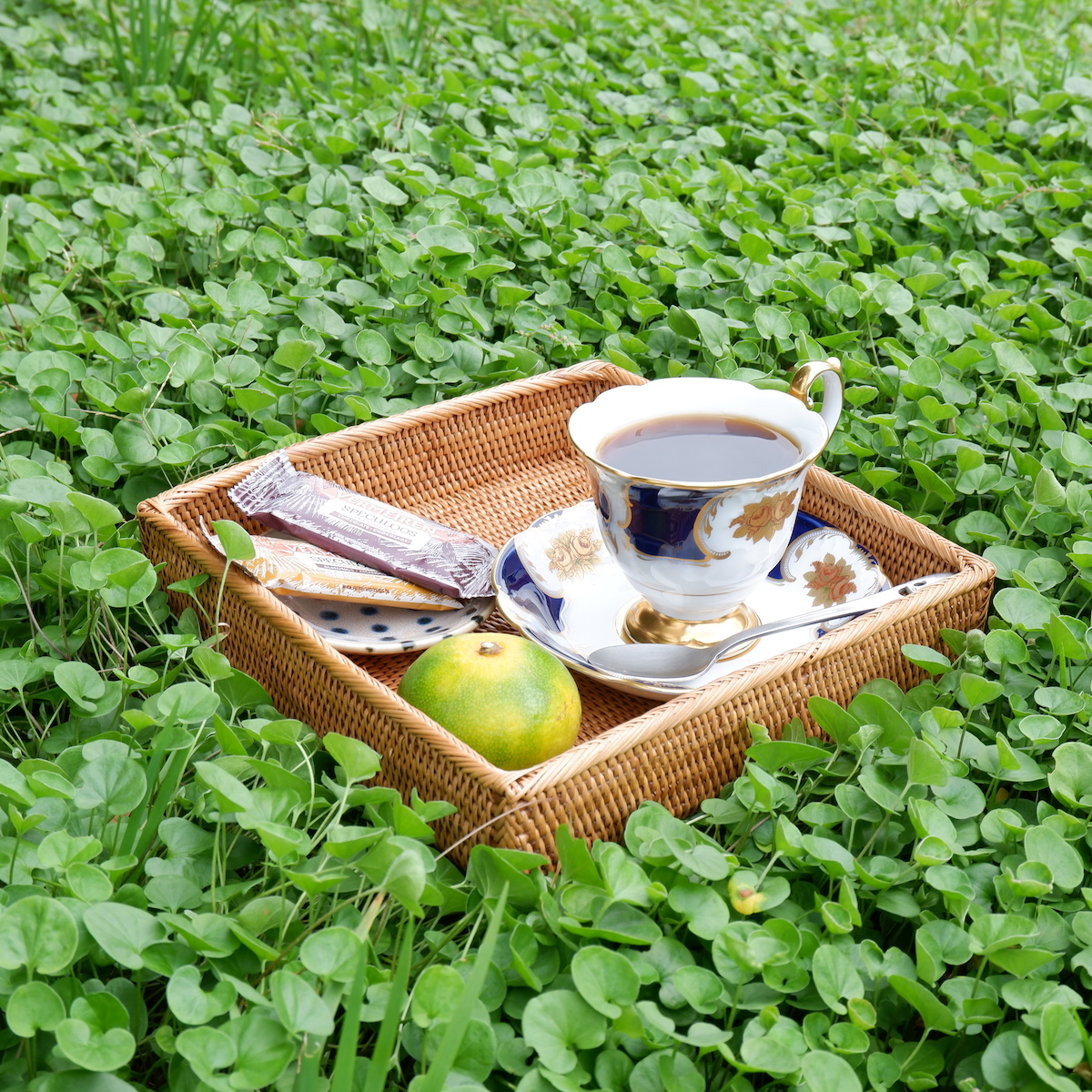アタ製トレイに、珈琲カップとお菓子を入れた小さな豆皿を乗せて。
