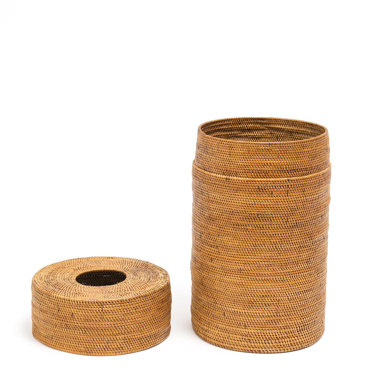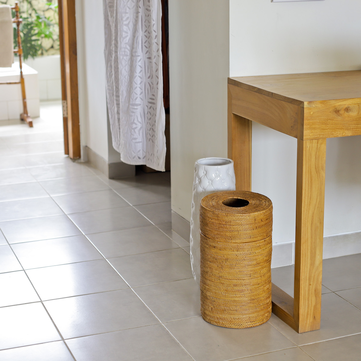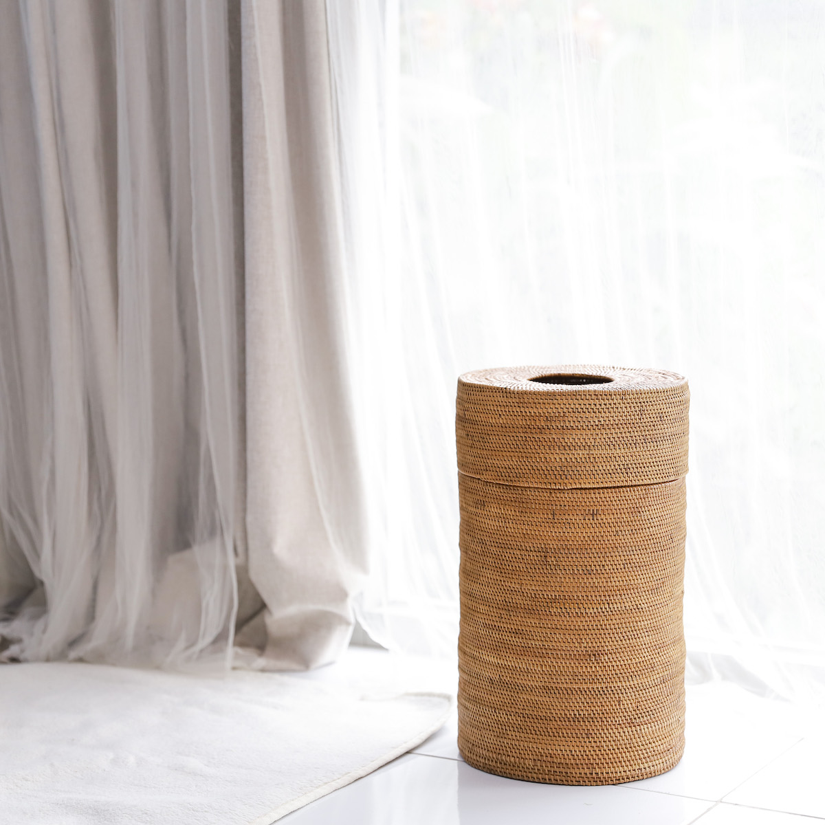 Inspired by traditional Japanese tea canisters, this unique Ata wastebasket replicates the elegant cylindrical form with exceptional craftsmanship from Bali.