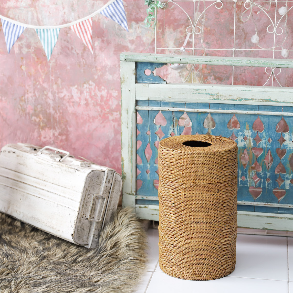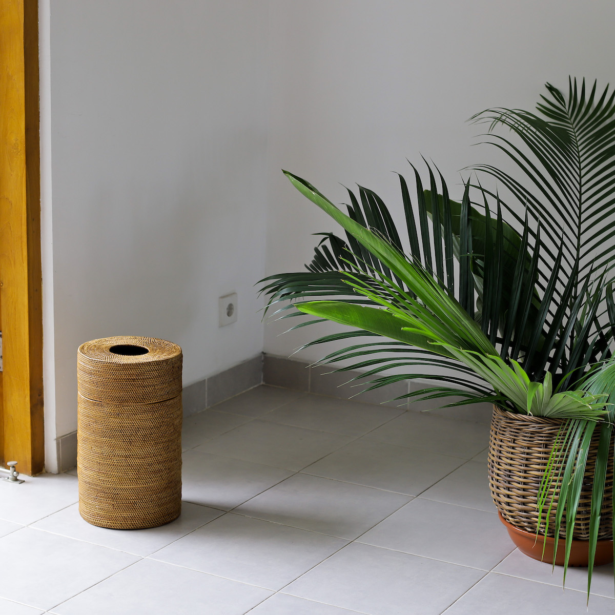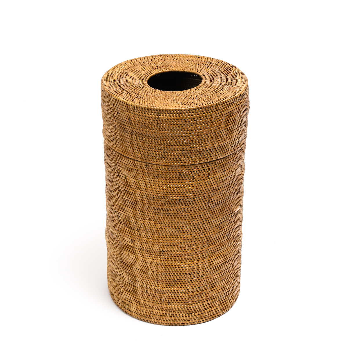 Inspired by traditional Japanese tea canisters, this unique Ata wastebasket replicates the elegant cylindrical form with exceptional craftsmanship from Bali.