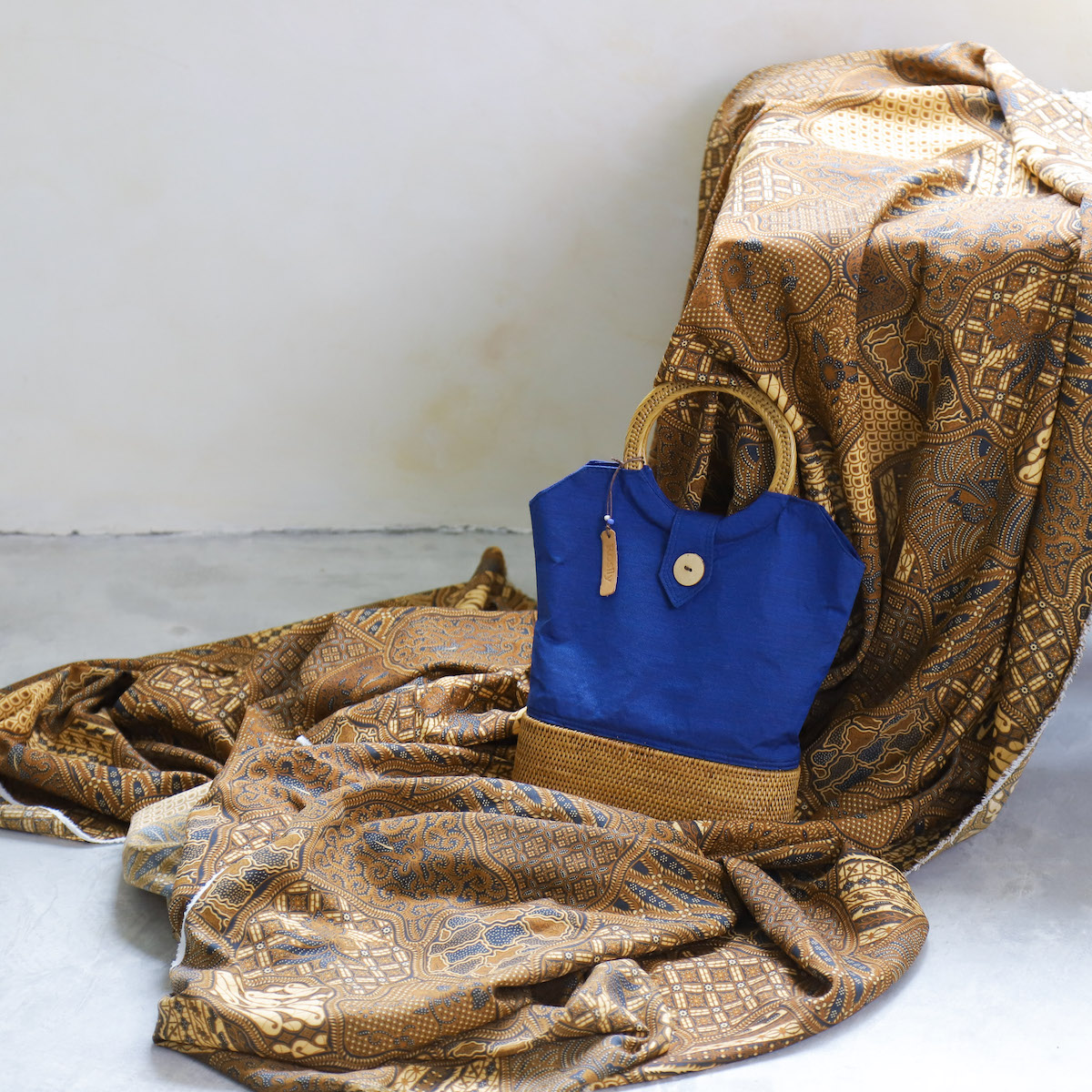 布地部分はインドネシアの伝統的なイカットで作られており、経糸と緯糸を異なる色で織り上げることで、光の当たり方によって表情が変わる美しい仕上がりとなっています。