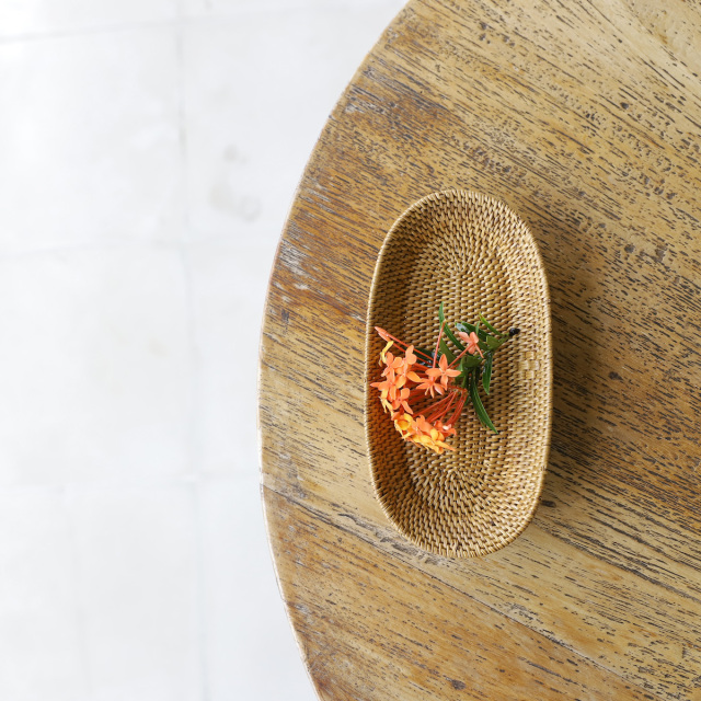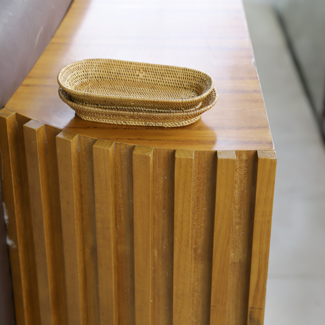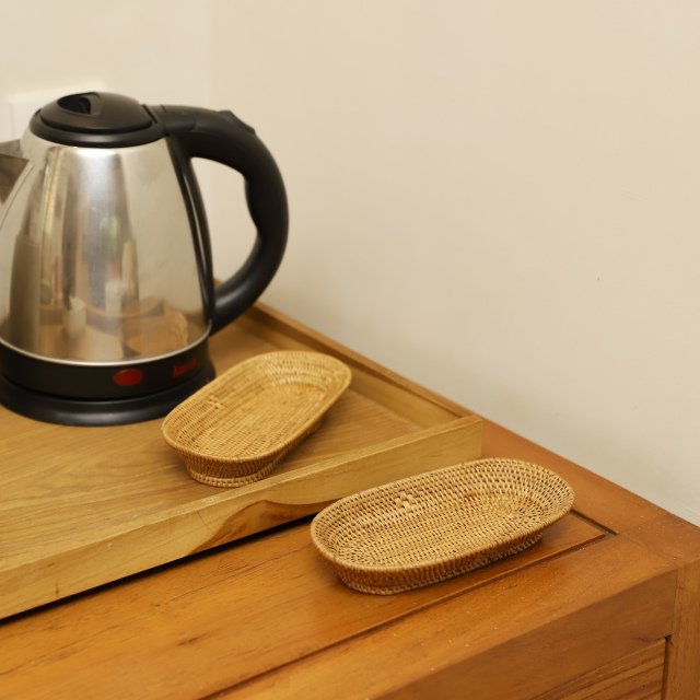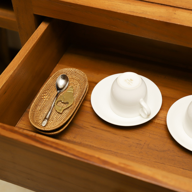 デスクの引き出しを開けると、珈琲カップの横にはカトラリーを入れたアタ製のトレイが用意されています。