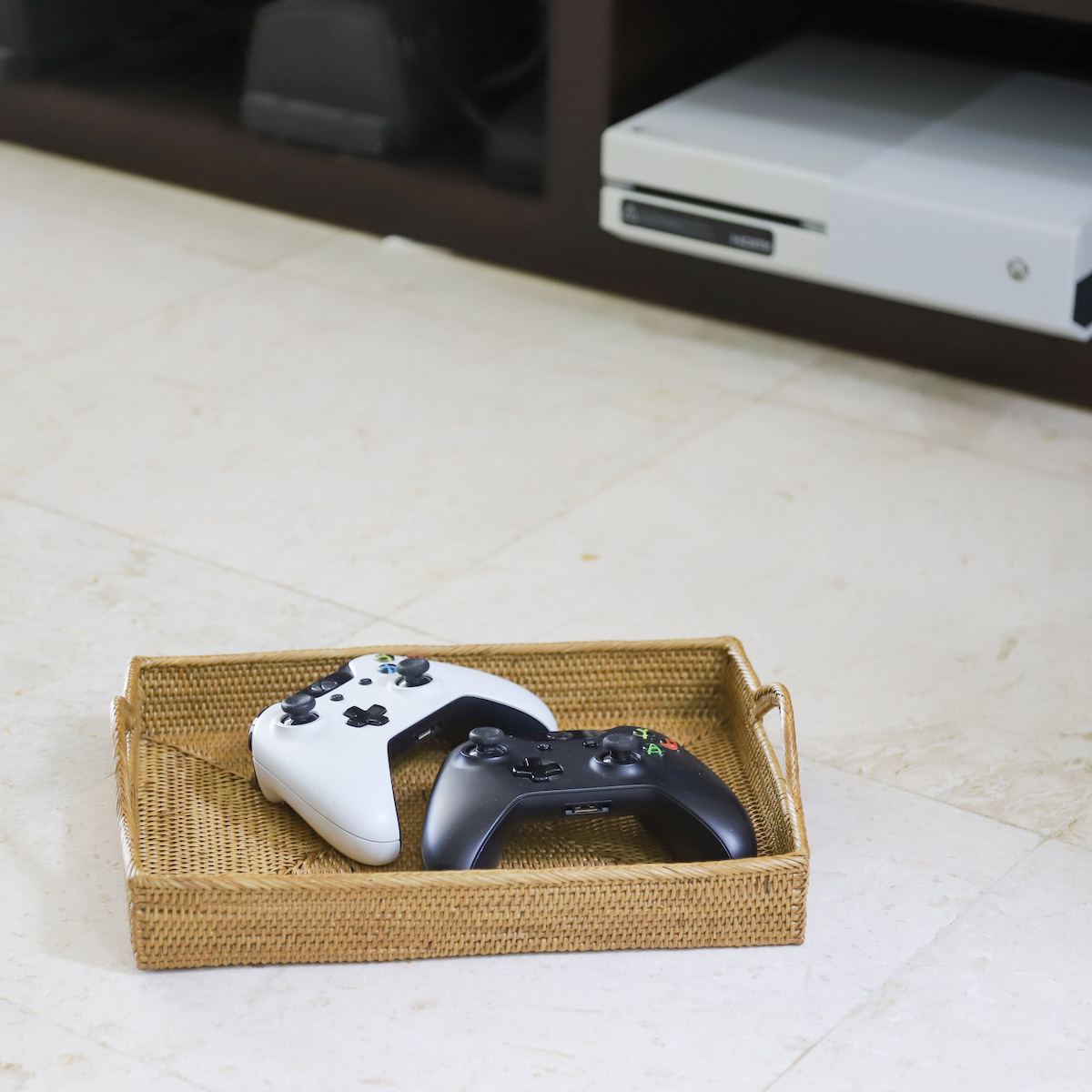 持ち運びが便利な、可愛らしい持ち手付きが付いた四角いトレイです。