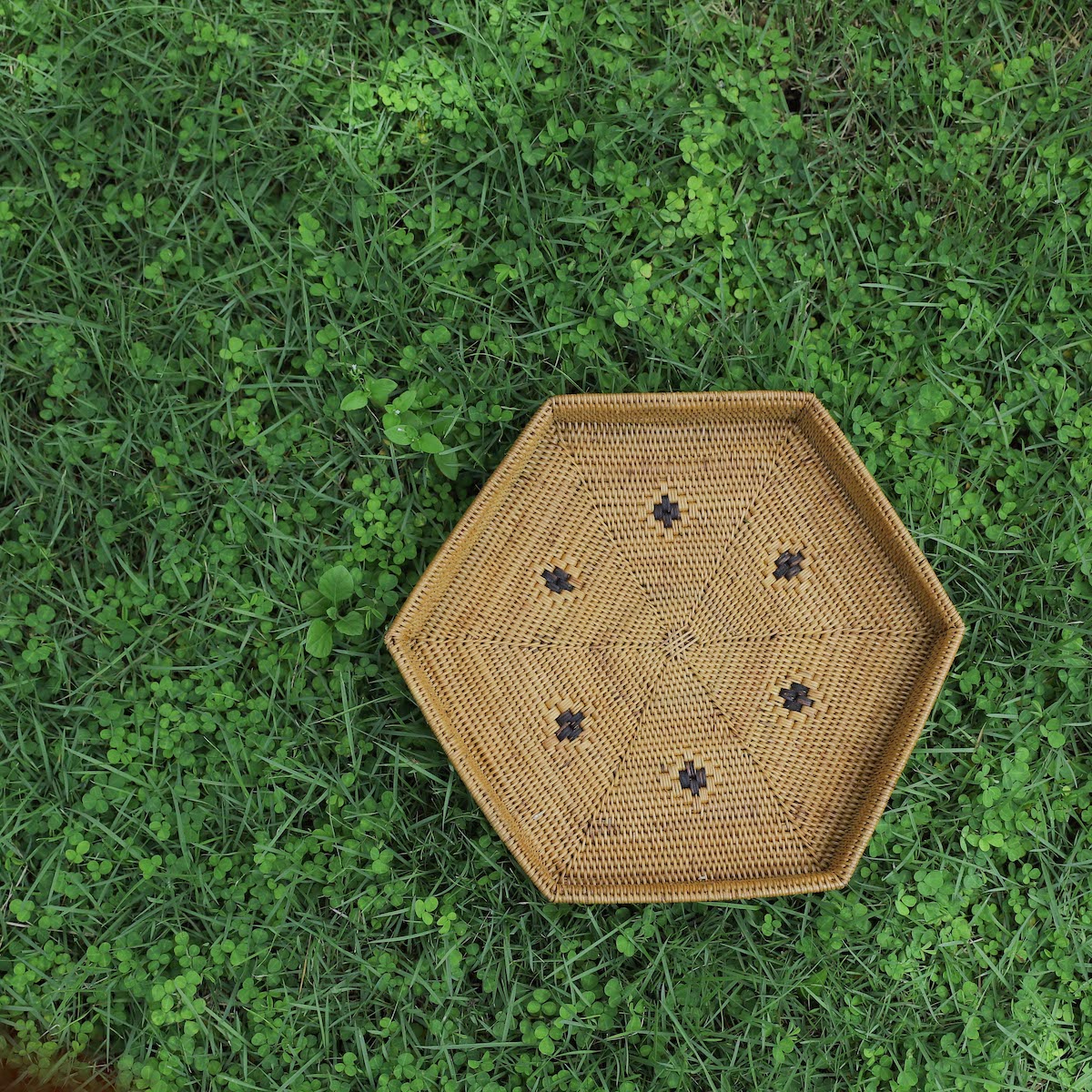 This elegant hexagonal Ata tray features a sophisticated geometric design.